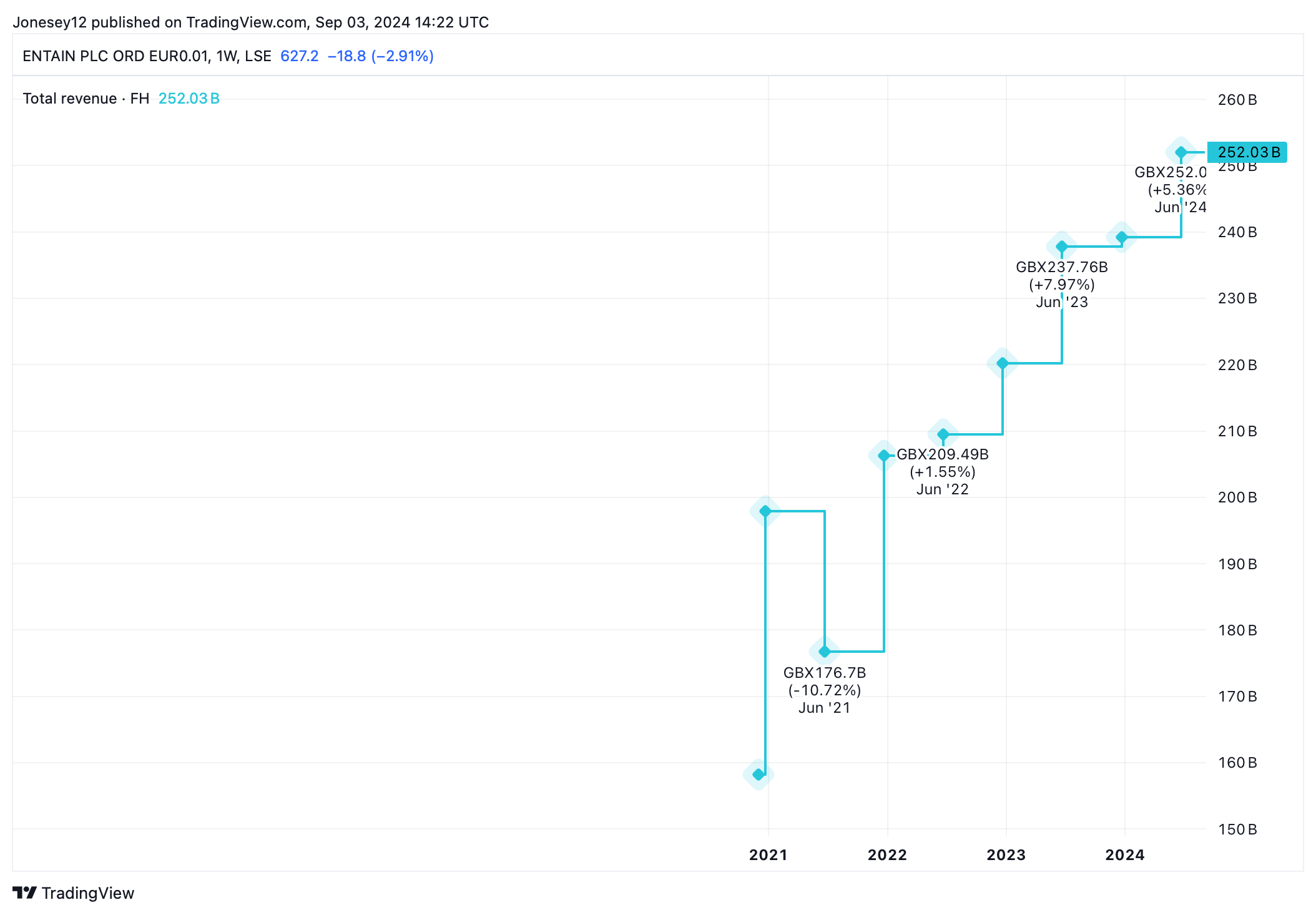 Gaming industry veteran Gavin Isaacs, who took charge on 2 September, is expected to steady things. Entain needs to knuckle down to the hard work of squeezing out the revenues. But they seem to be heading in the right direction, as this chart shows.