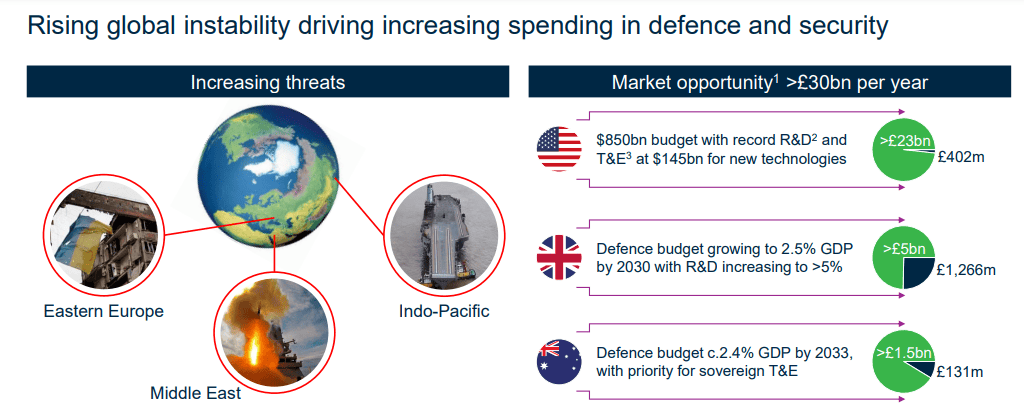 Consequently, QinetiQ sees large opportunities in all its markets, especially in the US. It made just over £400m in revenue there in its last financial year but now sees a £23bn+ total market opportunity.