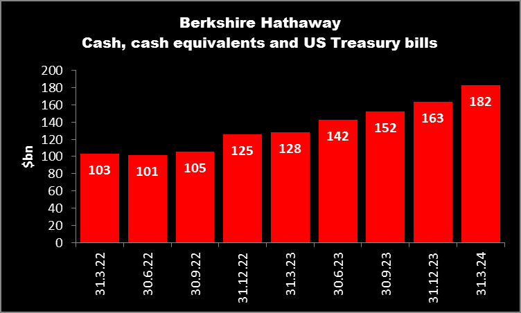 But on the other side of the Atlantic, Berkshire Hathaway — Warren Buffett’s investment company — has been building up cash. At the end of March 2024, it had cash and US Treasury bills (a proxy for cash) of $182bn on its balance sheet, an increase of 78%, compared to two years earlier.