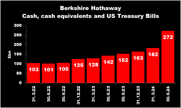Warren Buffett, as chairman and CEO of Berkshire Hathaway, is presiding over a cash balance of $272bn. As the chart below shows, the company’s cash, cash equivalents, and US Treasury bills — which are a proxy for cash — have been steadily rising since the end of 2022.