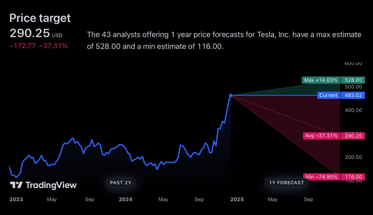Since the US election, the Tesla (NASDAQ:TSLA) share price has been hitting new all-time highs. But analysts don’t seem too optimistic about the outlook for the stock.