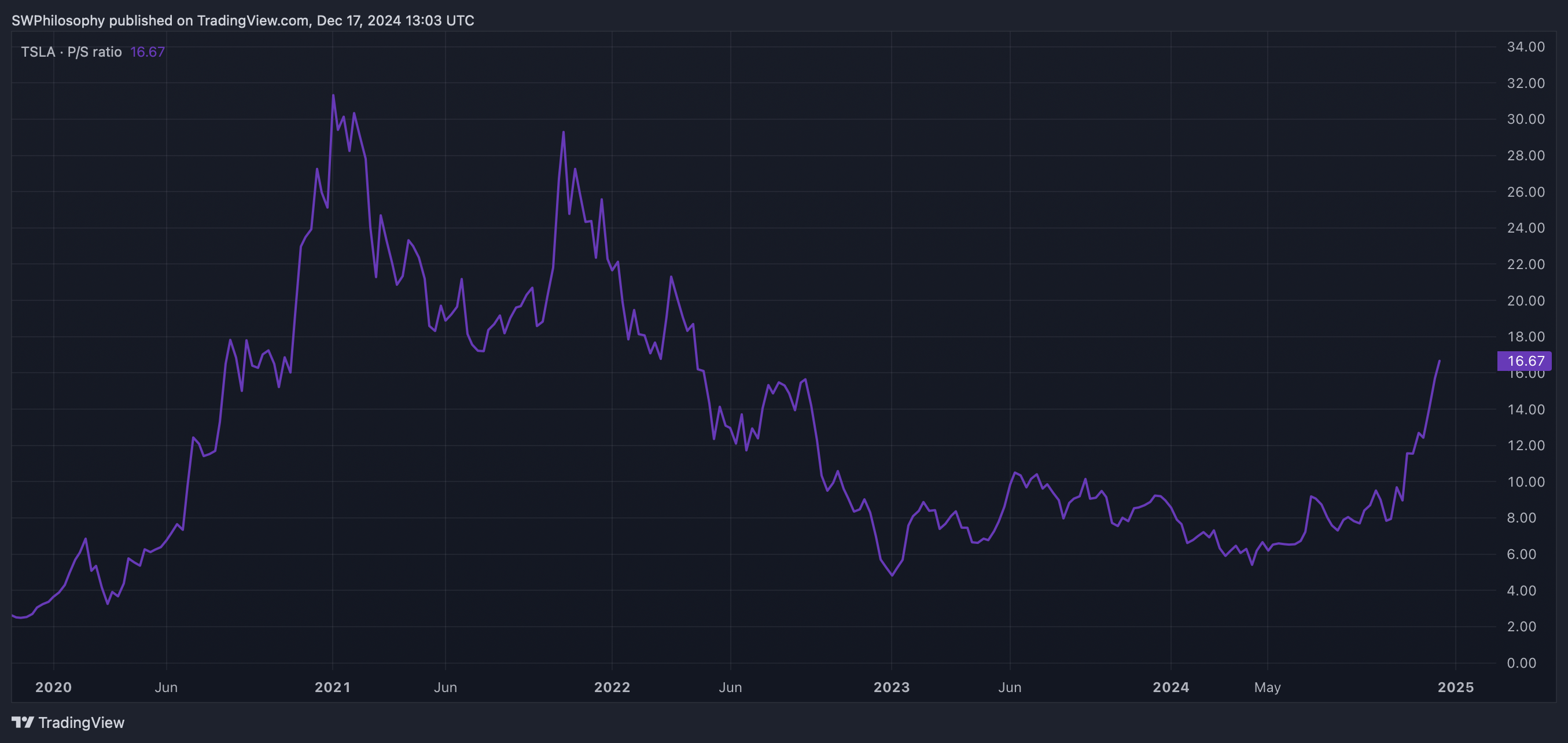 The first is valuation. The stock climbing only on the basis of the news – rather than earnings – has caused its price-to-sales (P/S) multiple to roughly double since November.