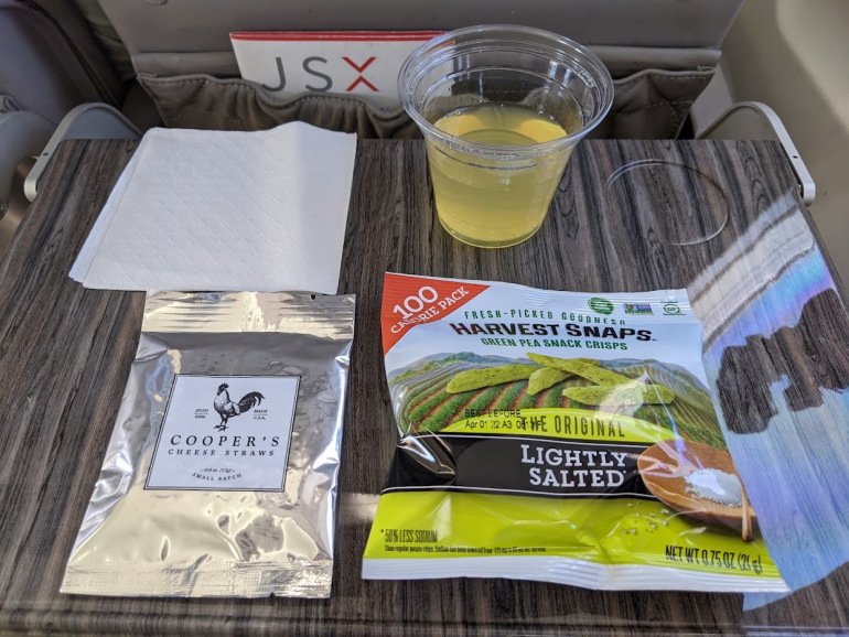 The flight attendant served drinks and snacks during the 43-minute flight. The plastic cups and packaged snacks from a snack basket felt a bit short of what you might expect when flying private. But, for the price I paid, it was perfectly fine. No additional drinks or snacks were offered.
