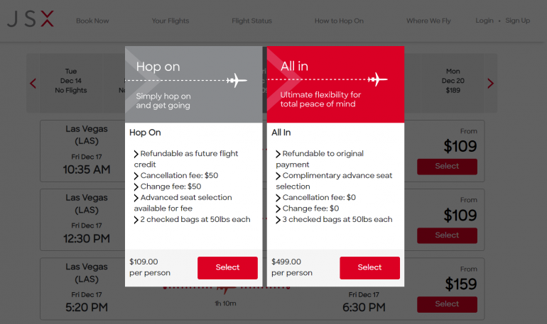 JSX offers two types of fares: Hop On and All In. Hop On is JSX’s cheaper fare type — with fees for changes, cancellations and seat assignments. Upgrade to an All In fare to gain the flexibility to change or cancel your ticket for no fees.