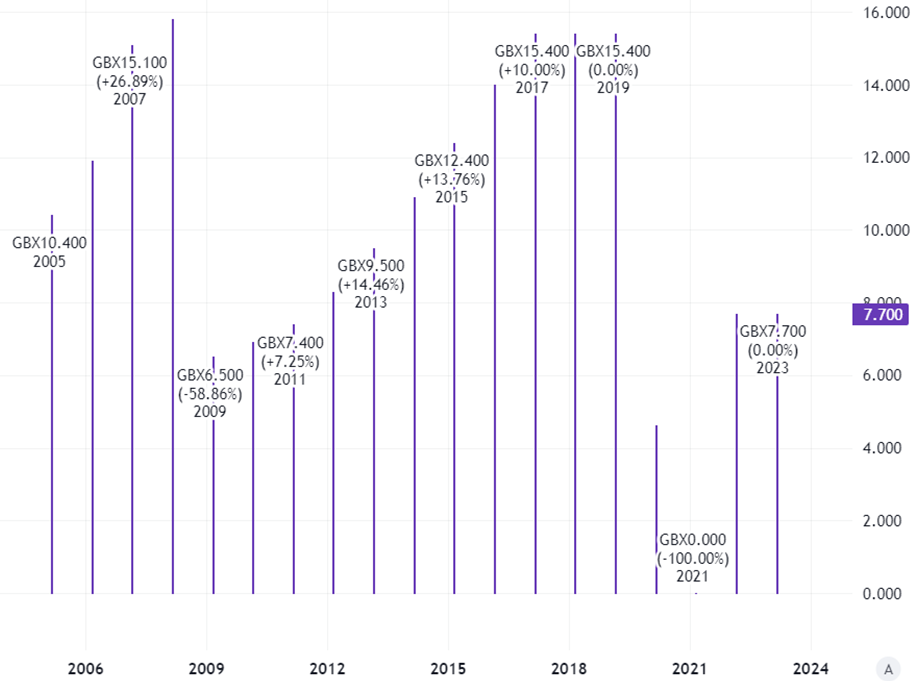 Last year’s dividend was the same as the prior year’s. The most recent, interim, payout was also held flat.