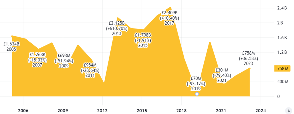 Consider the free cash flow picture at BT – how much hard cold money is actually coming in or going out of the door each year. Here the performance moves around a fair bit.