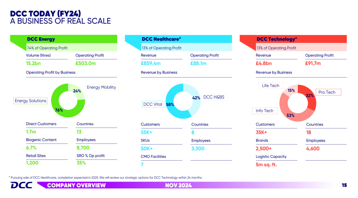 That looks cheap to me, but stocks can trade at depressed multiples for a long time. But DCC is looking to realise some of the value by divesting its healthcare and technology units.