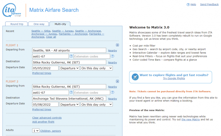 You can also use a more advanced flight search tool like the ITA Matrix to book your trip. Simply enter “as61-67” in the routing codes box to limit your search results to Alaska Milk Run flights.