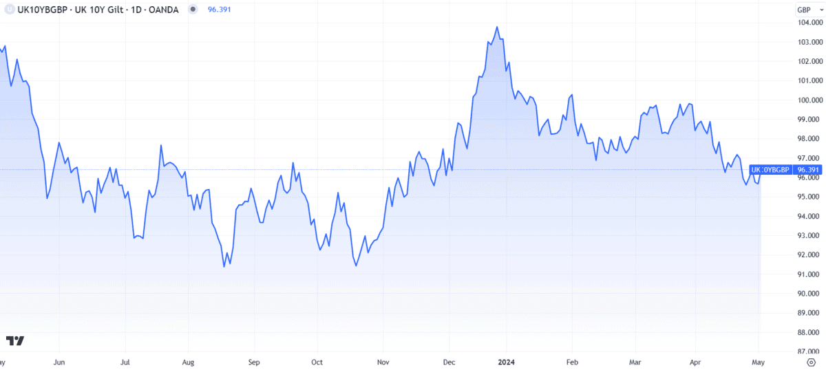 Hopes for rate cuts have faded in 2024, evidenced by sinking gilts. Nonetheless, yields haven’t eclipsed last year’s levels yet, suggesting there’s still some optimism for looser policy.