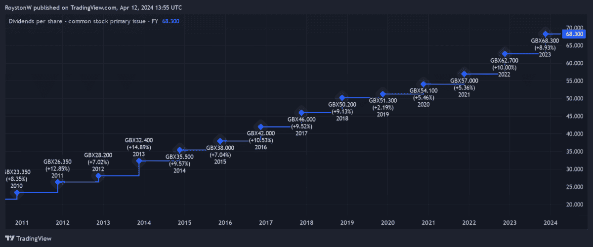 But what the company does have is an exceptional record of dividend growth. Shareholder payouts here have grown every year for 32 years, and at a compound annual growth rate of around 10%.